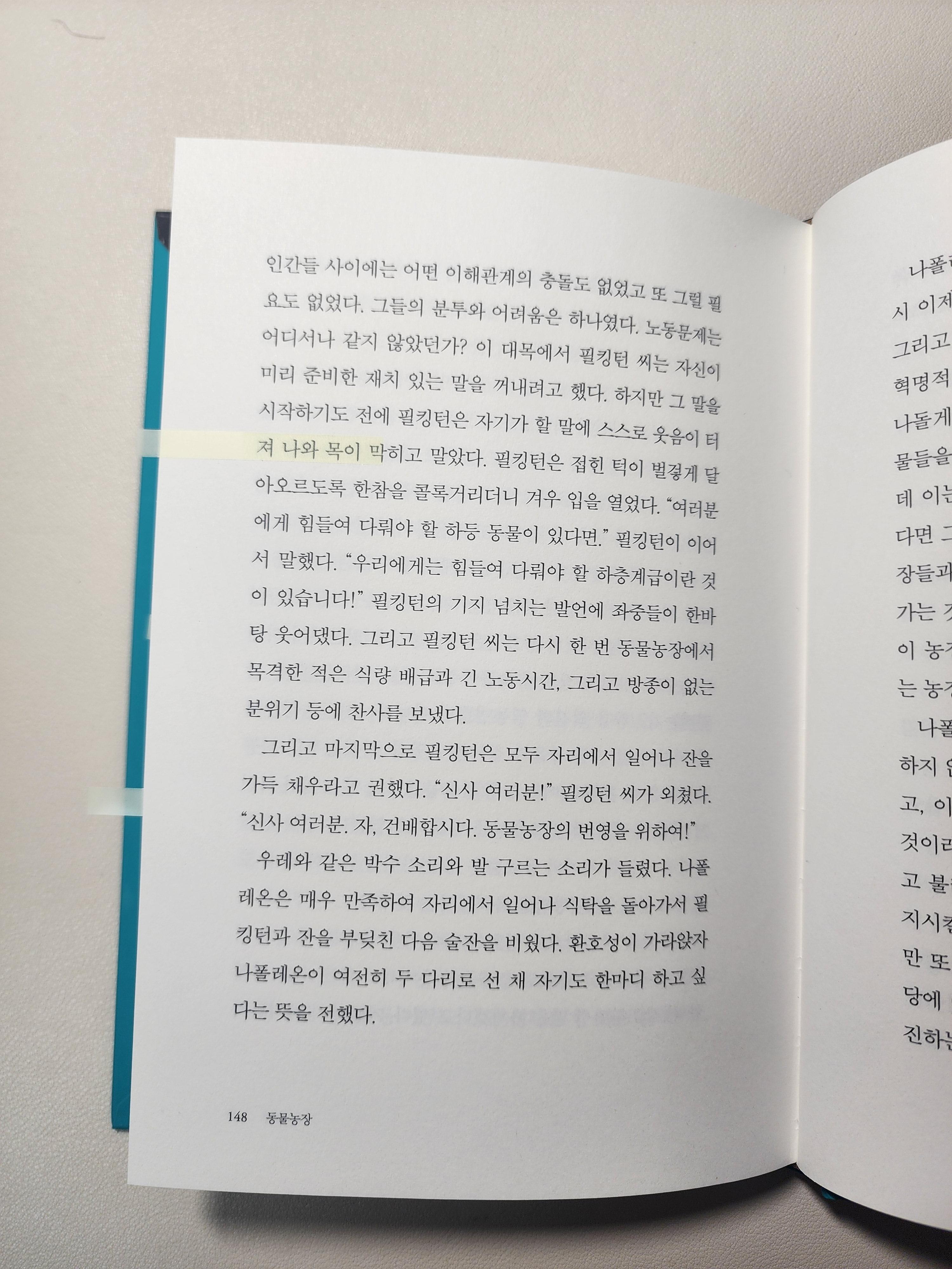 나폴레온은 이런 생각들이 동물주의 정신에 어긋난다고 맹렬히 비난했다. 진정한 행복은 열심히 일하고 검소하게 사는 데 있다고 했다. 농장은 예전보다 풍족해졌지만 그곳에 사는 동물들의 삶은 돼지들과 개들을 제외하면 그리 나아진 것이 없었다. p139